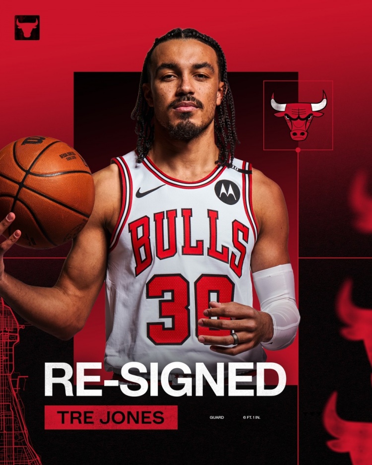 公牛官推晒照欢迎特雷-琼斯回归:我们和特雷-琼斯续约了