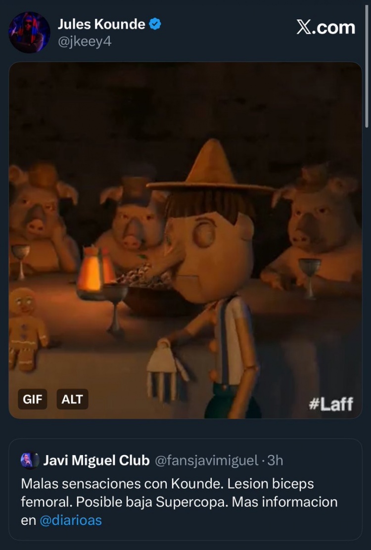 记者称孔德可能因伤无缘西超杯,球员社媒转发并晒匹诺曹辟谣